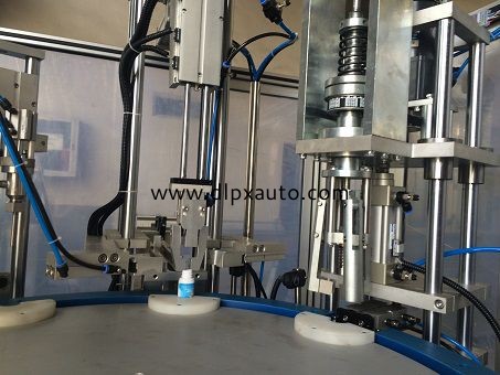 有輸送機將瓶子轉入灌裝位,自動灌裝,灌裝后再自動進入旋蓋,當瓶子轉到自動旋蓋過程中,瓶蓋有機械手夾子夾住瓶蓋,將瓶蓋送入瓶口上,
