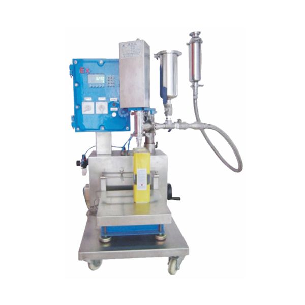 液體灌裝機主要由儲料斗、灌裝噴槍裝置、防爆控制柜、控制系統、稱重儀表、秤臺、升降裝置、氣動球閥、無動力輸送輥道,不銹鋼機架、壓蓋裝置等組成。