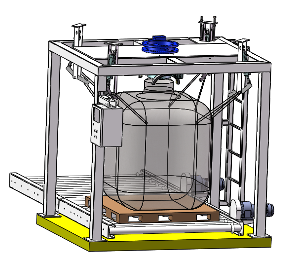 采用自流式重力給料結構,毛重式計量,三級給料控制結構,結合高精度稱重傳感器,給料速度可調,減少料流沖擊,保證計量精度和速度。灌裝時只需人工掛袋,給定信號后,便可完成自動夾袋、灌裝、計量、滿稱時自動停機、松袋的工作循環, 由叉車或輸送機直接輸出后吊裝儲運。