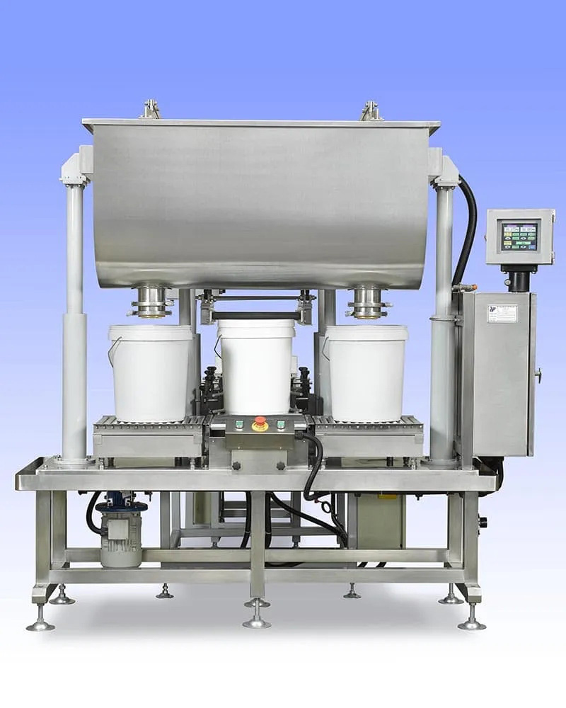 AF半自動(dòng)開(kāi)頂圓罐灌裝線,設(shè)計(jì)灌裝范圍為1~20kg重量。灌裝系統(tǒng)參數(shù)設(shè)置,自動(dòng)調(diào)整預(yù)設(shè)罐頭尺寸和重量。半自動(dòng)系統(tǒng)由兩個(gè)稱重灌裝站、自動(dòng)壓蓋系統(tǒng)和重力輸送機(jī)組成。其他在線站,例如皮帶輸送機(jī)(用于噴墨系統(tǒng))和運(yùn)動(dòng)檢查秤是可選項(xiàng)目,可以集成為灌裝線。