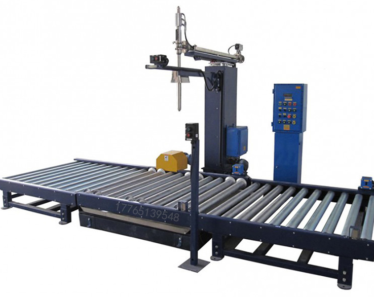 其操作流程為:人工上桶→人工對孔→自動灌裝→人工放蓋壓蓋→移載滿桶→人工碼垛。