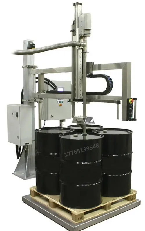 在操作過(guò)程中,一般是人工將空桶放置空桶區(qū)、自動(dòng)輸送至灌裝秤臺(tái)上,系統(tǒng)自動(dòng)定位尋找桶口,然后灌槍自動(dòng)插入桶口并將空桶自動(dòng)去皮,系統(tǒng)打開(kāi)球閥,采用三段式灌裝。灌裝結(jié)束后,灌槍自動(dòng)提升至桶外,滴漏盤(pán)自動(dòng)接至灌槍底部,灌裝完成。系統(tǒng)自動(dòng)輸送至?xí)捍鎱^(qū),人工鎖蓋。