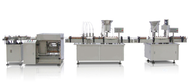 全自動(dòng)液體灌裝生產(chǎn)聯(lián)動(dòng)線(xiàn)由輸瓶機(jī)、直線(xiàn)式液體灌裝上塞機(jī)及多功能上蓋封口機(jī)組成,能自動(dòng)完成理瓶、輸瓶、灌裝、上塞、理蓋、上蓋、封口等工序,高度符合GMP要求。組成聯(lián)動(dòng)線(xiàn)的設(shè)備可單獨(dú)使用。
