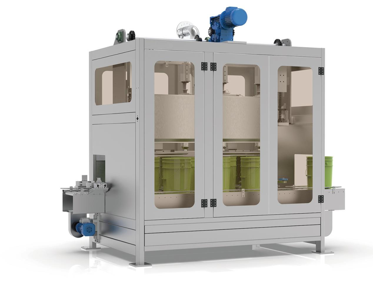 灌裝主機采用粗精兩步灌裝,保證灌裝速度和精度。灌裝結束后,接料盤伸出,防止灌裝頭滴落液體污染包裝物和輸送線體。采用觸摸屏實現人機對話,自動診斷功能,操作參數設定以及累計班產、工作狀態顯示等,自動去皮重、累計桶數、重量、顯示灌裝量、零點自動跟蹤、落差自動修正、超欠量、運行異常報警功能,高抗干擾能力,工作可靠。