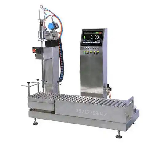 工作流程:空桶自動輸送-空桶撥至稱重區(qū)同時自動對桶口-空桶自動除皮-自動定量灌裝-自動推重桶至鏈板輸送線-自動上蓋同時自動鎖蓋-重桶輸送到重桶待提區(qū)-人工提走即完成;