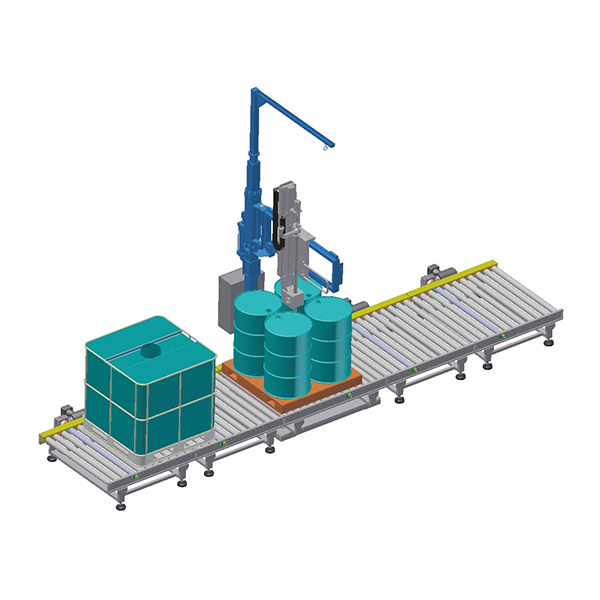 Automatic filling machine for weight filling of palletised containers from 20 to 1.500 lts. (drums, IBCs, totes, bulk containers, canisters, pails, etc.). Designed to be installed into a pallet convey